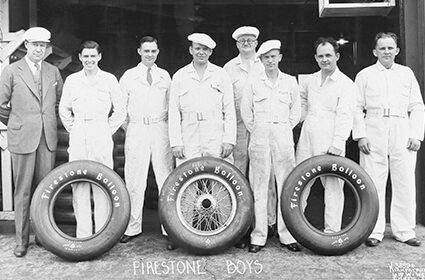 The “Firestone Boys” proudly show off the new gum-dipped balloon tires that first appeared at the 1925 Indianapolis 500. Firestone brand remains the exclusive tire of the Indianapolis 500 and the IndyCar Series.)