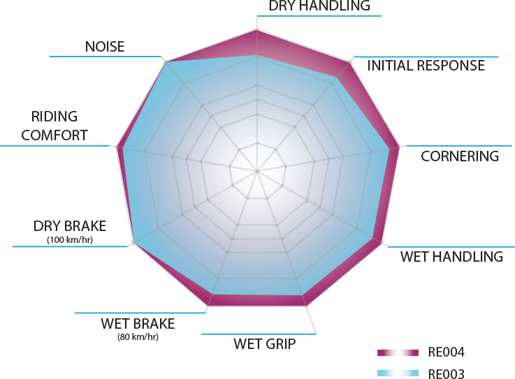 Potenza RE004 is built with an optimal mix of powerful traction and handling stability, both in wet and dry conditions.