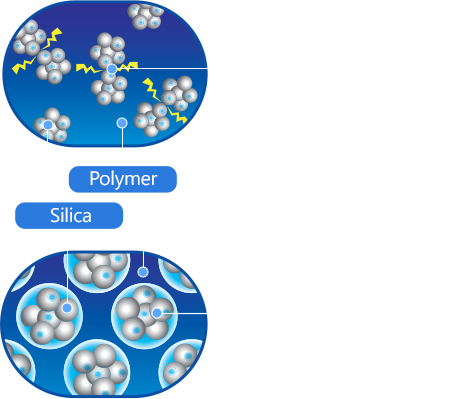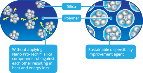 Nano Pro-Tech™ and a compound agent are used to strengthen the bond between silica and polymer, increasing their contact area. This reduces heat generation and energy loss, leading to a better wet performance.